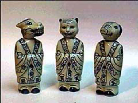 近くには、骨董品を扱う店が立ち並ぶキャット・ストリートがあり、そこをブラブラする。十二支のセットになった嗅ぎ煙草入れを見つけ、買う。こういうコワイイ(可愛いけど怖い)ものを見ると、すぐ欲しくなる僕の病気。こんなもの、一体どこに置いとくのよ! いいの! 欲しかったの! 写真は辰、寅、亥。