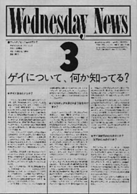 ウェンズデイニューズ(以下WNと記す)は、この番組から生まれたものです。実は、その第3号に載せた「ゲイについて、何か知ってる?」という文章は、その前の年に宝島本誌に書いたものの転載なんです。今、別冊とはいえ同じ宝島でゲイの本を一冊まとめていると思うと妙に因縁めいたものを感じます。それにしても、13年前にこういうものを書かせてくれた宝島の先進性に拍手を送ります。(ゴマスリスリ)