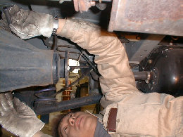 下にもぐってプロペラシャフト(ペラシャ)を外します。