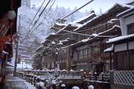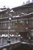 山形市内をぬけて銀山温泉へ向かっているはずなのに、雑誌で見たような町並みは一向に現れず、日は暮れるし、雪が舞い始め視界も悪くなり道間違えてないよねえなんて不安がよぎりはじめた、と・・突然 出たぞー温泉街!