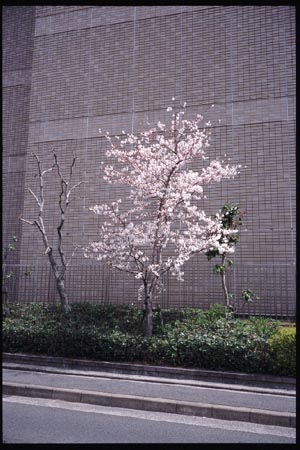 ビルの前に一本。レンガ模様の壁と妙に合っている。