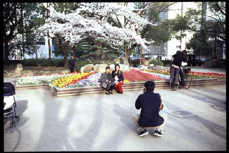 桜をバックに記念撮影。