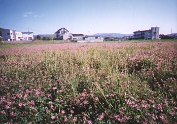 変電所の塀沿いに歩いてゆくと、坂を下る。そうすると突然れんげ畑が 目に入った。あぜ道に入り込んで近づくと、多分中をねぐらにしていたんだろう、鳥に怒られた。 前へ 次へ
