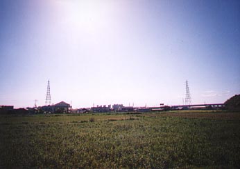 振り返ると休耕田。遠くに変電所からの鉄塔と高速道路が見える。