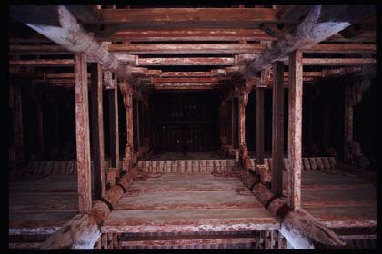 中門を下から見上げる。普通は途中から見えないのだが、ここは屋根まで吹き抜けで見える。見上げれば万華鏡だ。 フォトアルバムに戻る 次へ