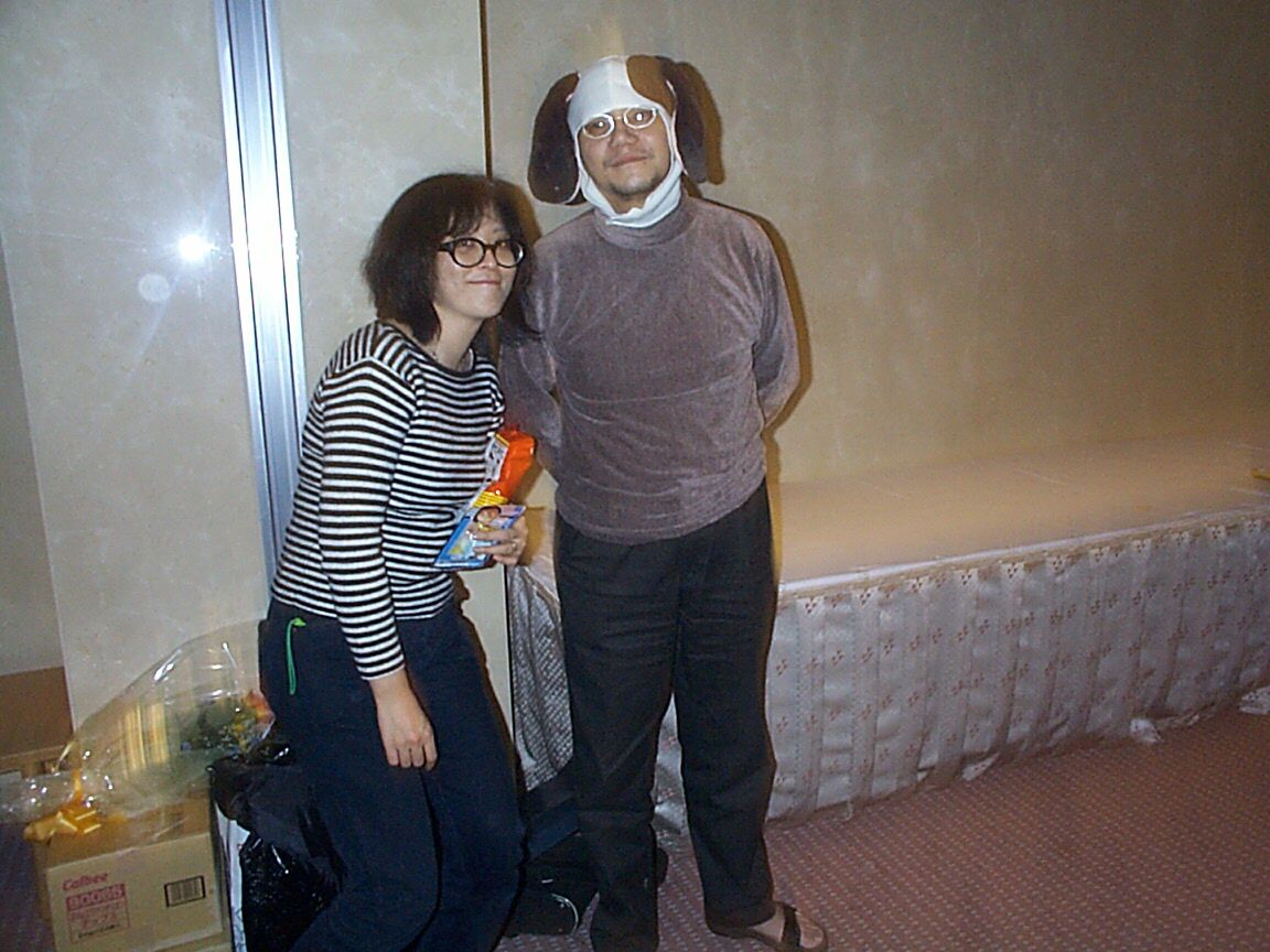 メンバーは、庵野監督、鶴巻・摩砂雪の両副監督以下、エヴァスタッフ数人&佐藤てんちょさん、喜国・国樹夫妻、水玉さん、大森・さいとう、竹熊さん、それに仲間由紀恵嬢を含む東映ご一行さま、うたたねひろゆき夫妻など。あとから樋口真嗣氏も合流し、なんか三次会とは思えない大宴会状態。前半は竹熊・喜国夫妻からマンガ業界ゴシップを大量に仕入れ、後半はGAINAX勢とエヴァおよびLOVE&POP話。結局、午前3時の閉店までだらだらして、最後まで残った連中で撮った記念写真がこれ。顔の判別がつくのはさすがメガピクセルの威力ですね。