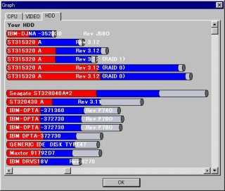 上から2番目がマザーボード標準インターフェースと接続、以降、RAIDボードと単独接続(1基のみ)、RAID1、RAID0(1回目・2回目)となります。 RAID1の結果を見て分るかと思いますが、結果がまちまちのときがあります。時には単独接続時並みの結果になる事も…。 ベンチマークソフトがいけないのか、ドライバー(Bios)が変なのか今回試した範囲では いまいち良く分りませんでした。気長にチェックしてく予定です。