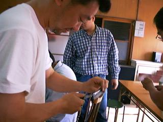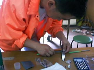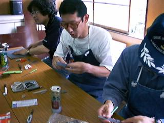 中部カスタムナイフクラブ会員を対象に、桜井氏を講師に招き、 ライナーロックのフォールディングナイフの製作について学びました。今回は、6時間の枠の中で、一通りを終えるため、あらかじめ得意のチタンを使った上級者用のキットを準備してもらいました。