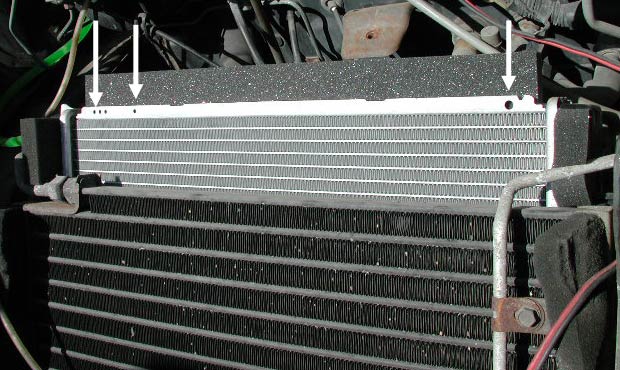 ここではラジエターに開けられている「穴」に着目する。下の写真は純正ラジエター。矢印部分に穴がある。