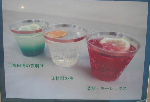 振る舞われたのは3種類。「海田湾の夜明け」だが、実際の所は湾の東側すぐに山がある。そのため水平線に近い所から日が昇るという感じにはならない。従って、カクテルの下側の青は海を指すのではなく、山を指していると思われる。