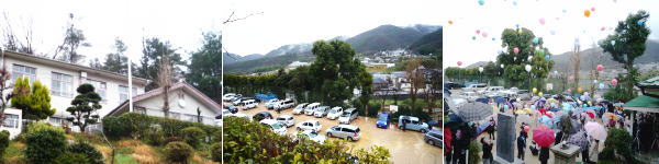| 風船飛ばしセレモニー 参列者の多くが、体育館から運動場に移動した。風船飛ばしセレモニーが今日の最後のメニューである。一向に止む気配のない冷たい雨の中を在校生とPTAの父兄を中心に色とりどりの水素ガス入りの風船が配られた。糸の末端には何やらメモ用紙が括られている。子どもたちの夢が書かれているのだろうか。PTA会長の挨拶の後、ファンファーレの音が流され、「いち、にぃ、さん!」の掛け声とともに一斉に解き放たれた。色とりどりの地上の雨傘の上空を色とりどりの風船の群れがまっすぐにゆっくりと浮上していく。子どもたちの夢を結んだ風船たちは、いったいどこに到達するのだろう。 |