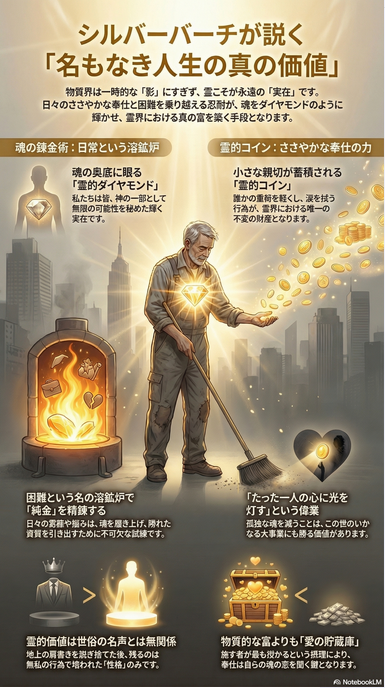 「小さな灯台」としての価値: 偉大な芸術家になる必要はありません。暗闇で苦悩する誰かを一人でも元気づけることができれば、その人生は十分に価値があり、目的を果たしたことになります。霊の世界では、名声よりも「無私の奉仕」という硬貨(コイン)が最大の財産となります。