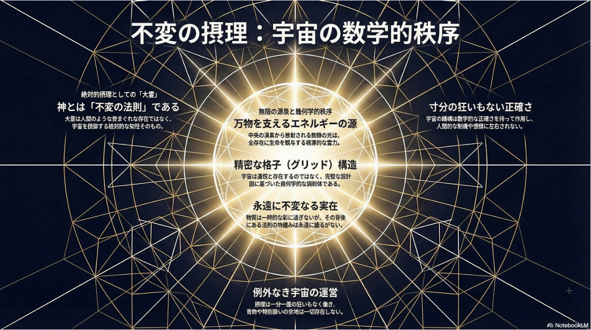 | 神(大霊)は人格神ではなく、宇宙を支配する完璧な「不変の法則(摂理)」そのものです。 中心から放たれる無限の知性が、精緻な幾何学的秩序(グリッド)となって、全宇宙を寸分の狂いもなく整然と運行させている姿を描いています。 |