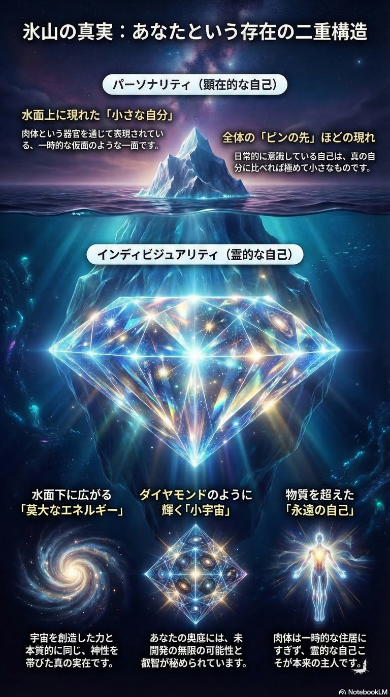 | 人間は「肉体を携えた霊」であり、霊こそが主人です。 氷山の一角として水面に現れている地上の人格(パーソナリティ)の奥底には、ダイヤモンドのように巨大で不滅な真の自我(インディビジュアリティ)が実在していることを象徴しています。 |