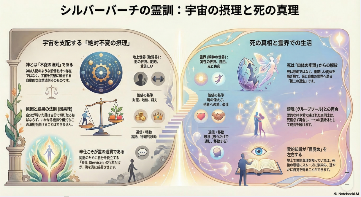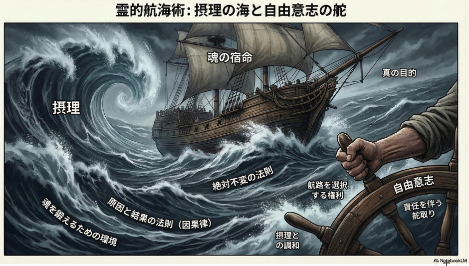 | 人生は、神が定めた「摂理」という海を渡る航海です。 変えられない潮流(宿命)の中で、自由意志という舵をどう操るかが魂の研鑽となります。 全ての行為は「公正の天秤(因果律)」によって正確に清算され、魂の進化へと繋がっていきます。 |
