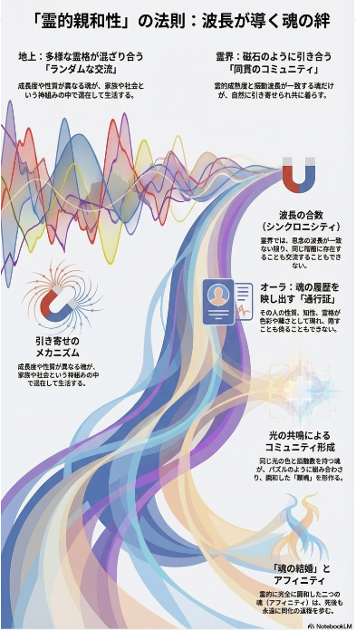 地上の生活は、霊格(霊的成長度)の異なる人々が混ざり合う「魂の訓練場」ですが、霊の世界ではこの「親和性」が物理的な壁よりも強力な仕切りとして機能します。
