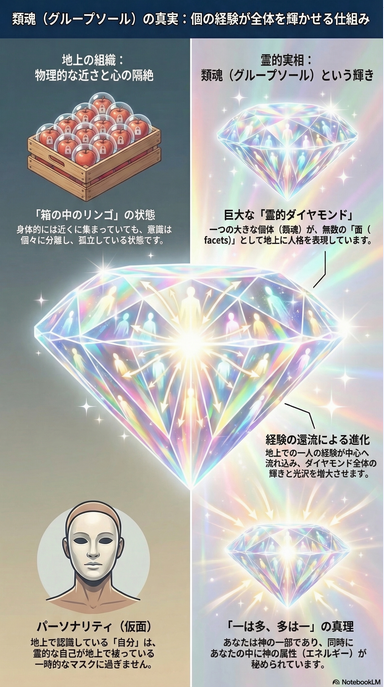 しかし、類魂の本質は「一にして多、多にして一」という統一体にあります。例えるなら、一個の巨大なダイヤモンドが類魂であり、地上のあなたはその「一つの側面(カット面)」に過ぎません。つまり、地上の組織は「他人の集まり」ですが、類魂は「本来一つである大きな生命の分身たち」なのです。