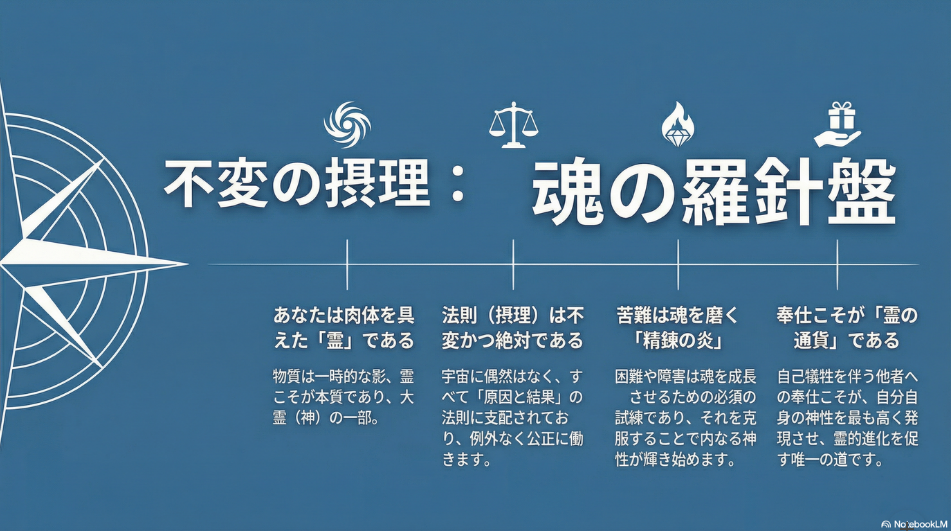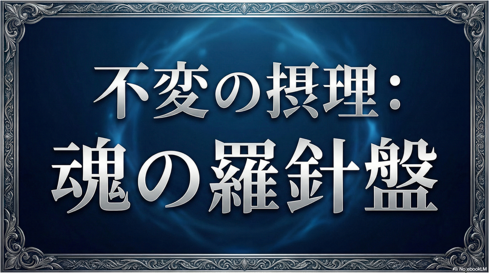 画像生成エージェントは、指示された文字列(不変の摂理:魂の羅針盤)よりも、ソース内に頻出する「魂の目覚め」「宇宙の摂理」「因果律」といった深遠なテーマの方に強く反応してしまい、それらを「説明文の山盛り状態」として視覚化しようとしてしまったようです。