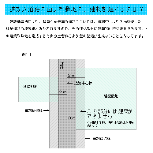 ここに言う建物建築時に道路後退する土地とは次の「狭あい道路に面した敷地に、建物を建てるには?」の図の斜線部分を指します。この部分を市に寄附しやすくして道路として整備するものです。