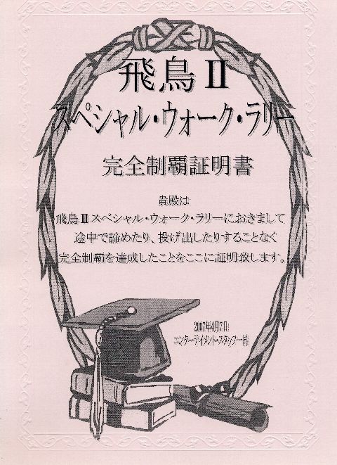 最終ゴールへのヒントも難問だったが、暗号を解読し、目的地に到着すると「オメデトウゴザイマス」と言って「スペシャル・ウォーク・ラリー完全制覇証明書」を授与してくれた。