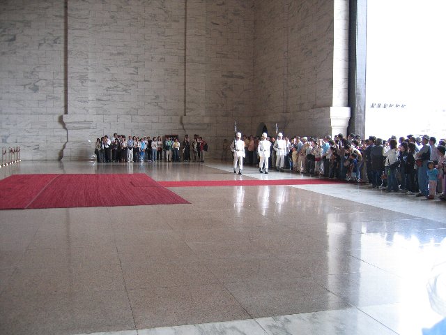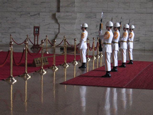 ここは辛亥革命をはじめとする一連の革命や戦争で亡くなった志士、軍人、約33万人の霊を祀る廟で、毎時衛兵交代がある。陸、空、海軍から選ばれた衛兵が、交代で大門と大殿の守護を担当。青い制服は空軍、白は海軍、グリーンは陸軍に属しているとのこと。いずれも各軍から選抜されたエリート達で、勤務に就くと1時間は直立不動の姿勢を続けなければならないそうだ。