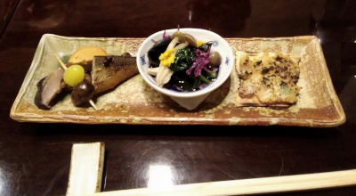 前菜:むかごと銀杏、子持ち鮎、鯖の燻製、あんきも