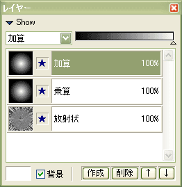 グラデーションレイヤーのレイヤーモードを左図のように変更してください。 下の方が「乗算」、上の方が「加算」です。