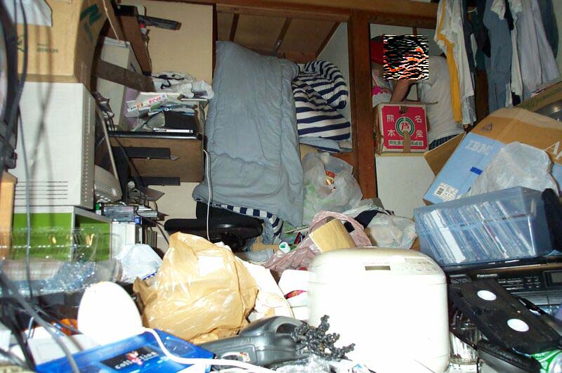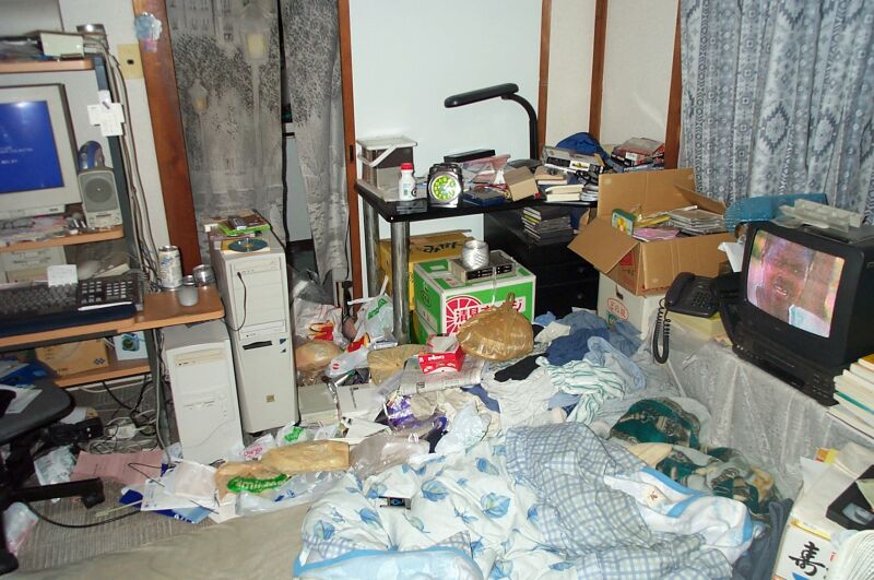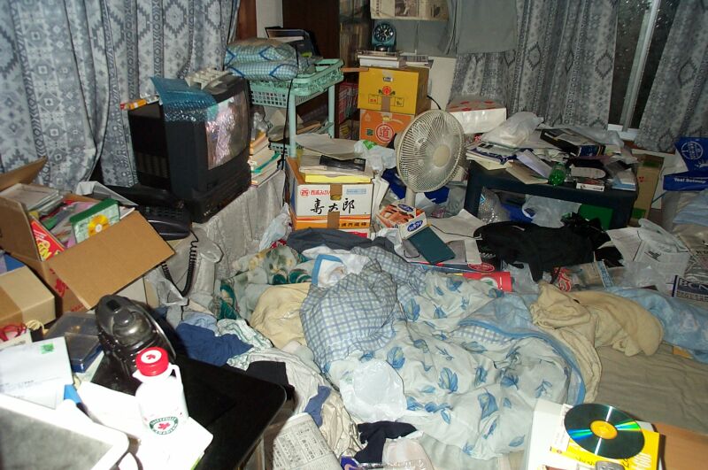歩くときは大股歩きが基本で少々不自由な部屋ではあるが、床に転がっているのは紙と洗濯済みの衣類が中心であり、ビン缶の類いや食品関係のゴミはほとんどないので悪臭やカビとは無縁に近いことは「普通」の人々も認めている。惨状3の写真ではコンビニ弁当の袋が目立つが、これは撮影日が収集日の前日だったためであり、翌朝には捨てた。
