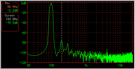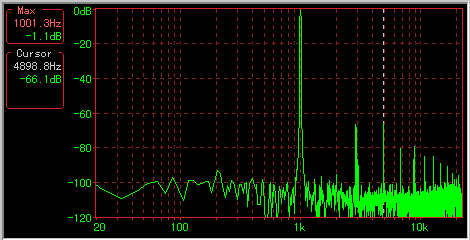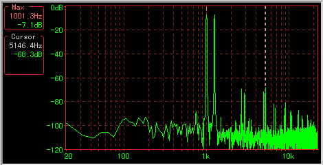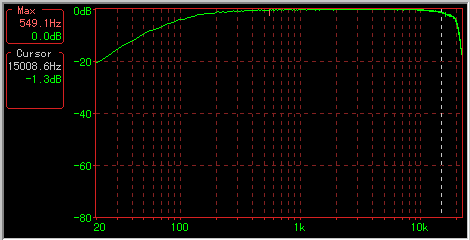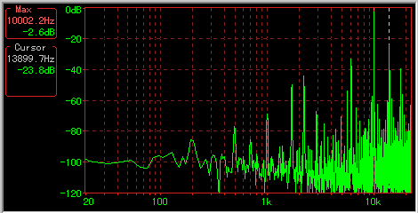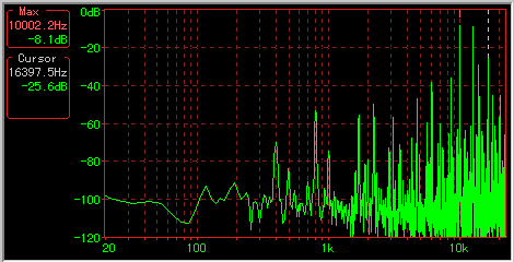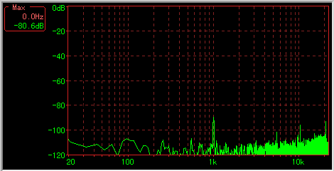 まずは、0dBのimpulse応答による周波数特性と、1kHz、0dBの正弦波を再生している際にライン入出力間を開放した場合の基板上での信号の回り込みです: