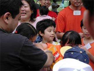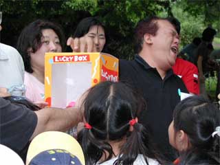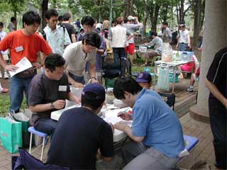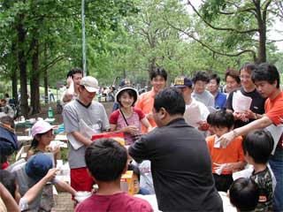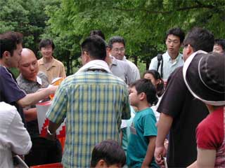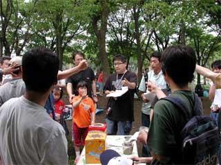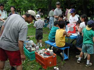 今回は亀有カブトとその比較的ご近所の方々が里子オフ運営スタッフとなり、 2001年5月26日、「第4回まちかねBBS主催里子交換オフ」が 東京都葛飾区の水元公園で開催されました。 参加下さった方々とご出席されなくても里子だけ送って下さった方々の 里子は下記の通り数量、種類共に前回を大きく上回るものとなりました。 総数719頭(当日追加除く) 種類(亜種)66種! 外国産比率80%!! ![]() ![]() ご協力頂いたすべての皆様、この場をお借りし、厚く御礼申し上げます。 前回同様ジャンケン合戦&抽選箱方式をとりましたが、今回は時間短縮と ギャンブル性を高める為にあらかじめ里子をA、B、Cと3つに分け、2つの 抽選場を離して設けてA,Bの抽選を同時に行い、CはA,Bの抽選が完了後、全員 で行いました。 ![]() A,Bの抽選は二手に分かれて行った為、どちらの里子を狙うか事前に 作戦を立てなければならなくなり、大変盛り上がりました。 特に稀少価値の高い物を勝手にCとしたのですが、こちらは全員での抽選 と言う事もあり、かなり白熱した争奪戦となりました。 ![]() ![]() ![]()