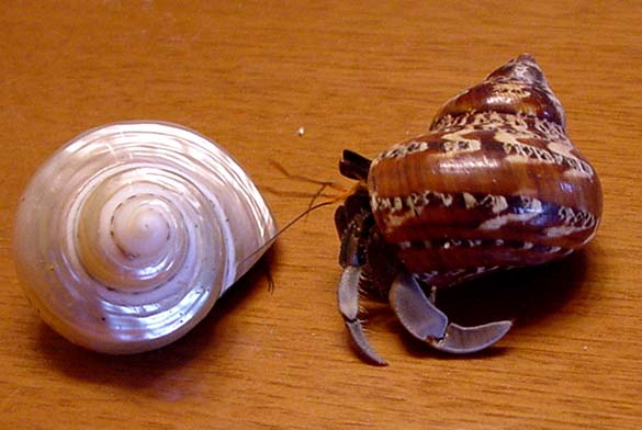 くそ〜〜採るとこ見たかったよ〜正確には65.5mmでした。新成虫のようでした。エンダー蔵(^^v トラップ回りの木もチェ ックします。しばらくして、亀有さんが、「痛てっ!」と言い足元を見ま す。あっしの脳裏には”ハブ?、ムカデ?”といった物が浮かびましたが、 ライトで照らすと、そこには黒い小さな塊が剥きだしのふくら脛にくっつ いて居ます。「?」なんと、それは小さなサキシマ♂でした。「脚トラップですね。」と3人で大爆笑。 その後、ショウロウクサギの高い所にも大きな♂を発見、うちらに気づき、 大顎を目一杯開いて威嚇している。とってもかっちょええ。サキシマは結構しっかりしがみつくので、ちょいと揺らしても落ちて来ない事が多いそうだ。たたき落としても見つかる様に、足場を均し、枝でたたき落とす。 無事ゲッチュ〜!! 本日3頭目。60mm程の立派な♂でありました。 この後、マルバネポイント等を探しに行きましたが、成果は得られず、 キャンプ地に戻りました。 とっても感動的な採集シーンでした。あれを見られなかったエンダーさん、可哀想...。 その後、Tさんは家に戻り、残ったおいらと亀有さんは今日の採集の成果 をつまみに残ってるお酒を飲んでました。 さて、寝ようかと思って、寝る前にちと小便しにいくと、砂場をのそのそ 移動する大きな物体が。暗闇にゆっくり移動するその姿が何となく蛇の頭 に見えて、ライトで照らすと、南洋栄螺(トゲの無い栄螺ね)???と良く見ると大型のオカヤドカリさんでありました。亀有さんを呼んで良く見 ると、それはもう沢山の動く貝が。楽しいので二人で急拠ヤドカリ採集。 大きいのから小さいのまで。子供のお土産には最高です。ほんの10分程で50個位は採りましたでしょうか。 今度こそ本当に就寝です。亀有さんが、ヤドカリのタッパとサキシマのル アーケースをエンダーさんの枕元に置いて。(笑)