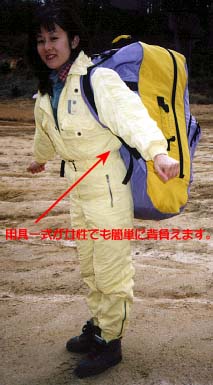 ご覧の通り女性でも簡単に背負えるくらいの重量です。だいたい10KG前後です。