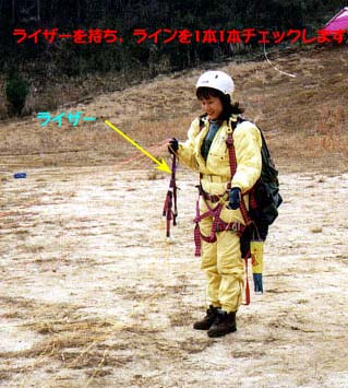 1、テイクオフする場所でキャノピーを広げて、ラインチェックをしその後にハーネスを付ける