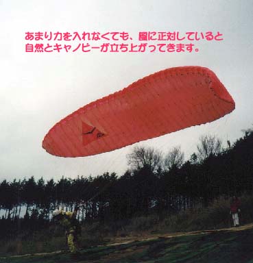 キャノピーが70度から80度位の角度まで立ち上がったところで、持っていたライザーを離し、次にキャノピーが前に行きすぎないように、