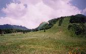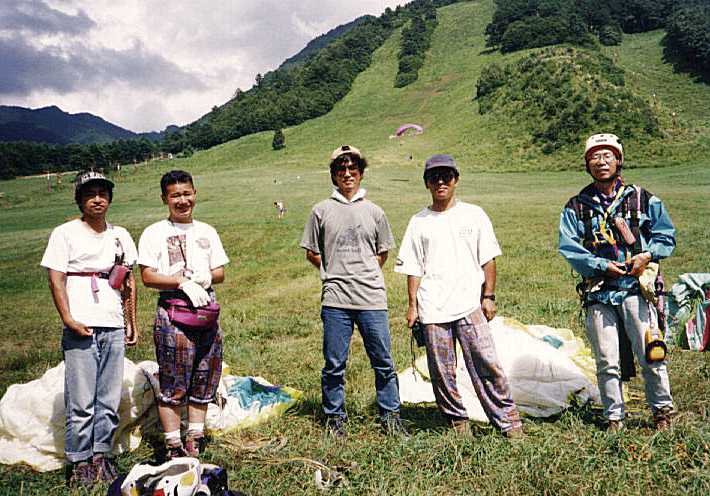 テイクオフの後ろ側に山田牧場が見える。大会などでは、左手後方の草原上部から一斉テイクオフをするとのこと。
