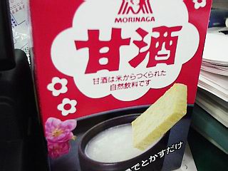 | 寒い季節になりましたが、みなさん風邪などひかずに元気にお過ごしでしょうか?@は甘酒など飲んであったかくしてますからとても元気です♪……なんちゃって。 という訳で、インスタント甘酒です。缶入り甘酒も有名なので、そっちを飲んだ人も多いかな?。そういえば、缶入り汁粉なんてのもあったっけな(^-^;)……。<え?飲んでみろってか(^-^;)?? フリーズドライなので、形状は高野豆腐に似てます(笑)。とてもモロいですけどね。この形状は、最近、卵スープやお粥の素にもよく見受けられるので、ピンとくる方もいるでせう。出来上がりは、右の写真の通りです。半生の米粒(フォークにすくわれている)がやや気になるとはいえ、お湯での戻し具合も完璧で、酒粕オンリーではなく麹から作ったらしいことが想像できます。 味は、それなりにコクもあってなかなかですが、甘味料を使っているらしく、とにかく激甘です。もうちょっと甘さ控えめでも良かったですな(^-^;)。 | |