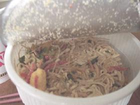 ◎鮑とフカヒレ味 遂に出ました中華名品!!! 右写真をご覧戴ければかろうじて分かるのではないかと思いますが、麺の上に載っかってる細いスジがフカヒレなのではないかと推定されます(^^ゞ)。 鮑の方は、写真を撮る時に取り除いてしまったのですが、香味油としてちっちゃな袋入りで添付しておりました。味は薄くてあんまりよく分からん。……っつーか、鰒の味ってよく知らんので比較できんわ(^-^;)。 |