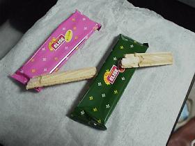 | @が12年11月頭に家族旅行で行ってきた仙台でゲットした品です。(ちなみに、一昨年行った時は、ジャンボアポロ・さくらんぼエンゼルパイを、昨年はラフランスポポロン・りんごコロン・おっとっとみちのくチーズ味をゲットしました)。「エリーゼもの」は最近各地で展開しているようなので、要・チェックっす! 東北、ということで、ネタは「さくらんぼ(左側ピンクのパッケージ)」と「りんご(右側濃緑色のパッケージ)」です。りんごモノの菓子は他地区(長野)でもあったりしますが、サクランボは東北独特ですね。やはり山形か? 味の方は、やや香りと酸味がキツいかな〜、と言う感じです。エリーゼ自体がクリーム(チョコレート?)がメインの菓子なので、さくらんぼ・りんごの風味もクリーム部分についています(モナカ部分には風味はついていません)。そのため、クリーム部分の味がキツ目についているのかもしれません。次は、モナカ部分にバラエティーのあるモノを期待しています(´ー`)。 |
