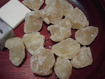 形状は左図の通り、粉ふき芋をそのまま甘納豆にしたようなモノ。味は、じゃがいも自体にあまりクセがないので、「美味い・不味い」の以前に、とにかく甘い(^-^;)。食感は、じゃがいものさらさら感が豆に似ており、味に