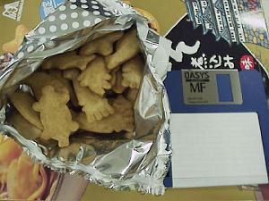 職場の人から、出張のおみやげ。名古屋にてゲットしたとのこと。 おっとっと、ですね( ̄ー ̄)。 しかも、「みそ煮込みうどん味」! う〜ん、渋いね、大人の味(笑)。さわやかな味ではないわな(爆)。 職場の皆で分け合って食したのだが、概して若い人には評判が悪かったが、係長等の中年層にはかなりウケが良かったというのが隠れたポイントかもしれません。 ちなみに、パッケージにも「ジャンボおっとっと」あるとおり、デカイです(隣に置いたフロッピーディスクと比較してみて下さい)。 次は天むす味だっっ!(^-^;) |