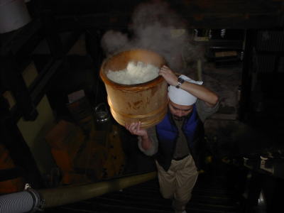 米を蒸している釜から二階の麹室へ、昔ながらの木桶を使って運び上げています。これがなかなか息が切れるんですよ。