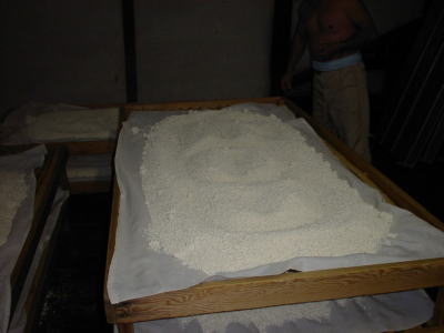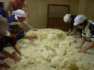 麹室の前では昨晩種付けがされた酒米が真っ白になっていました。塊が無いようにバラバラにこなしています。