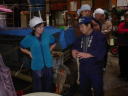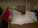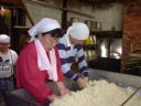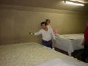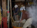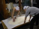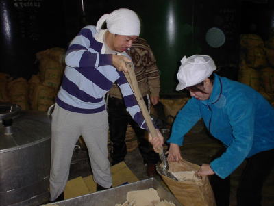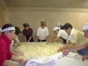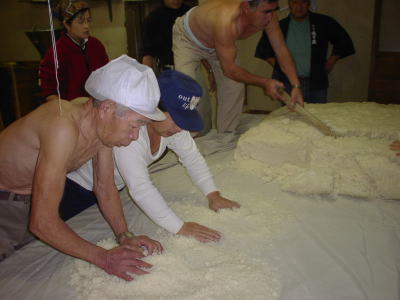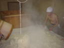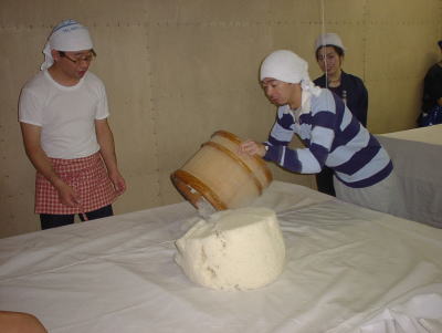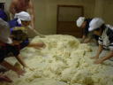 杜氏さんのデモンストレーションが終わると、われわれの出番です。現在1階では大きな釜で米が蒸されていて、出番を待っています。手際よくやらないと後が詰まっているので大忙し。