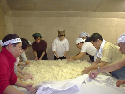 釜から運んだ米が36度まで下がったら、麹菌をつけます。これは杜氏さんのデモンストレーション。