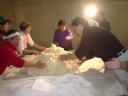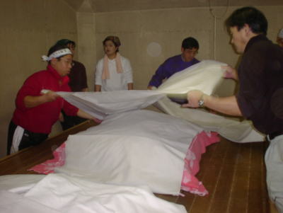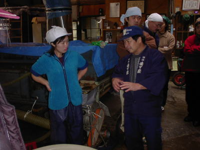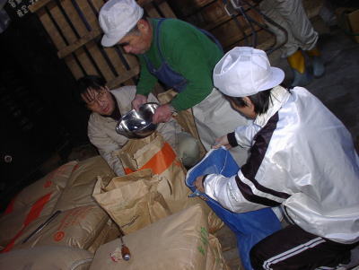 杜氏さん、女性に囲まれて機嫌よさそう?。蒸した米の温度を計っているところです。