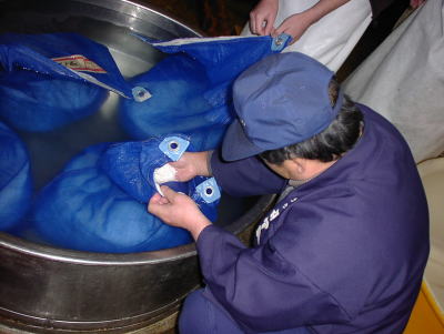 洗米の作業は、この袋の中に手を突っ込んでかき回して洗います。新しい水をふんだんに使うその作業は本来は零度の水なのですが、今回は弁天の水を汲んできたばかりだったのでけっこう温かい水でラッキーでした。