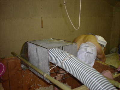 一階の釜から機械を通して一気に二回の麹室へ運んでくれるパイプです。ジェットエンジン(^_^;)みたいな音がして迫力があります。これで↑で紹介した木枠の中に米がたまってくるのです。