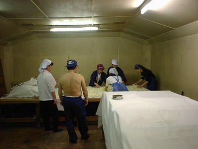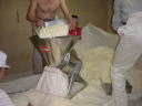 もっとも忙しい作業のひとつ。釜から出した米を温度を冷ましながらバラバラにしてくれる機械なのですが、なかなか思い通りの大きさになってくれないので、ここで細かくしています。この写真では2人でやっていましたが間に合わなくなって6人でやっている写真もあります(^_^;)