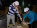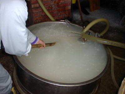 杜氏さんといっしょに酒母のタンクを覗き込んでいます。強烈な吟醸酒の香りがします。どぶろくってこんな感じだったらしいですね。
