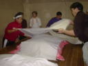 で、中心に集めた米を布でぐるぐる巻きにして保温します。翌日には表面に麹菌が白い粉を浮き出させます。